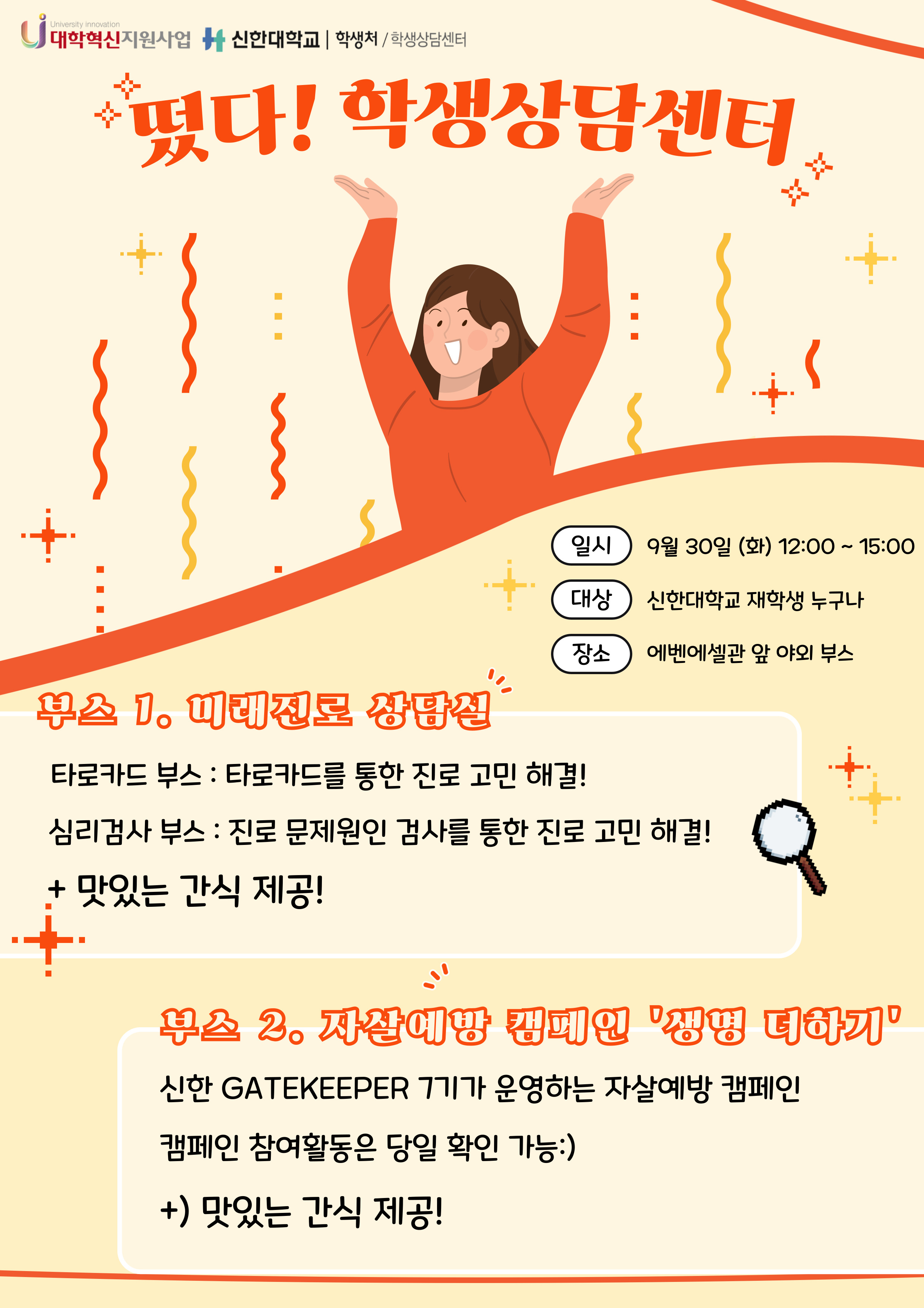 안녕하세요! 신한대학교 학생상담센터에서 공지드립니다~![]()