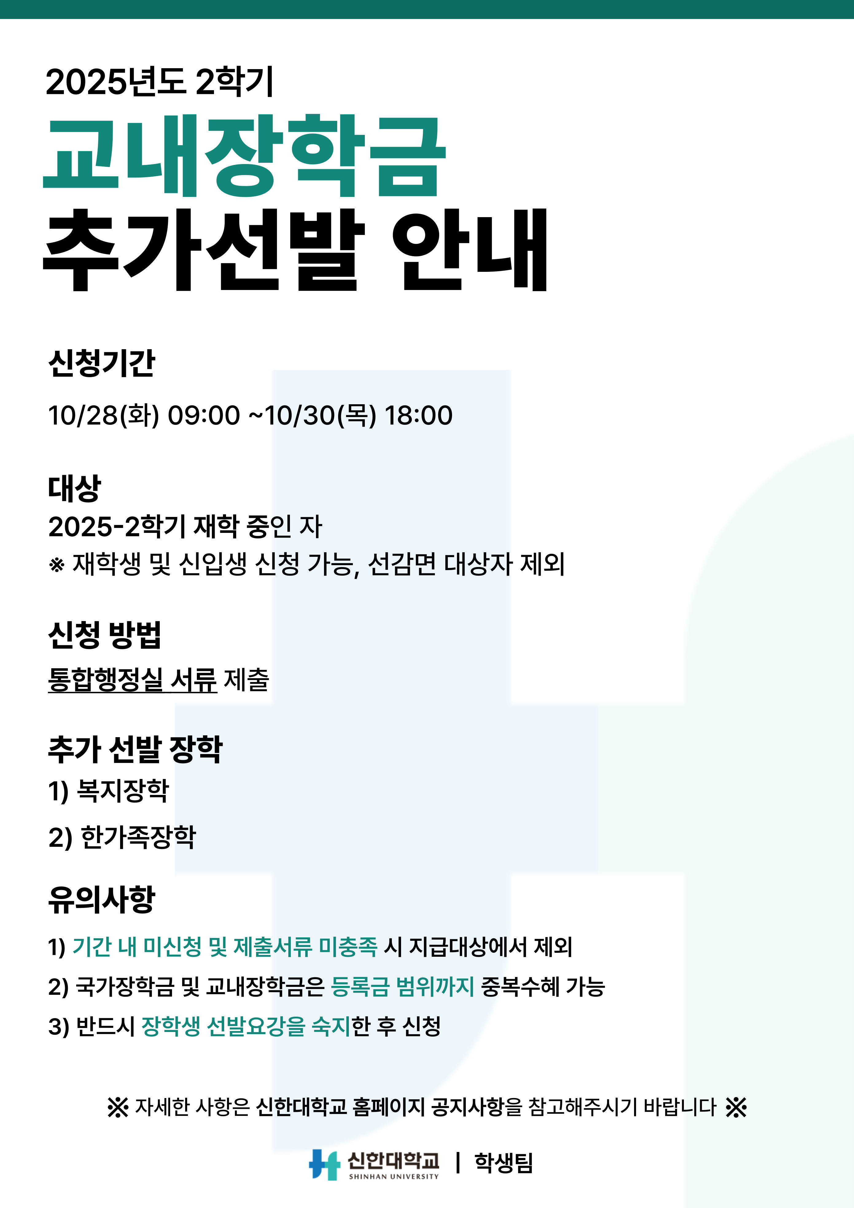 [교내장학] 2025학년도 2학기 복지 및 한가족 장학생 추가 선발 안내