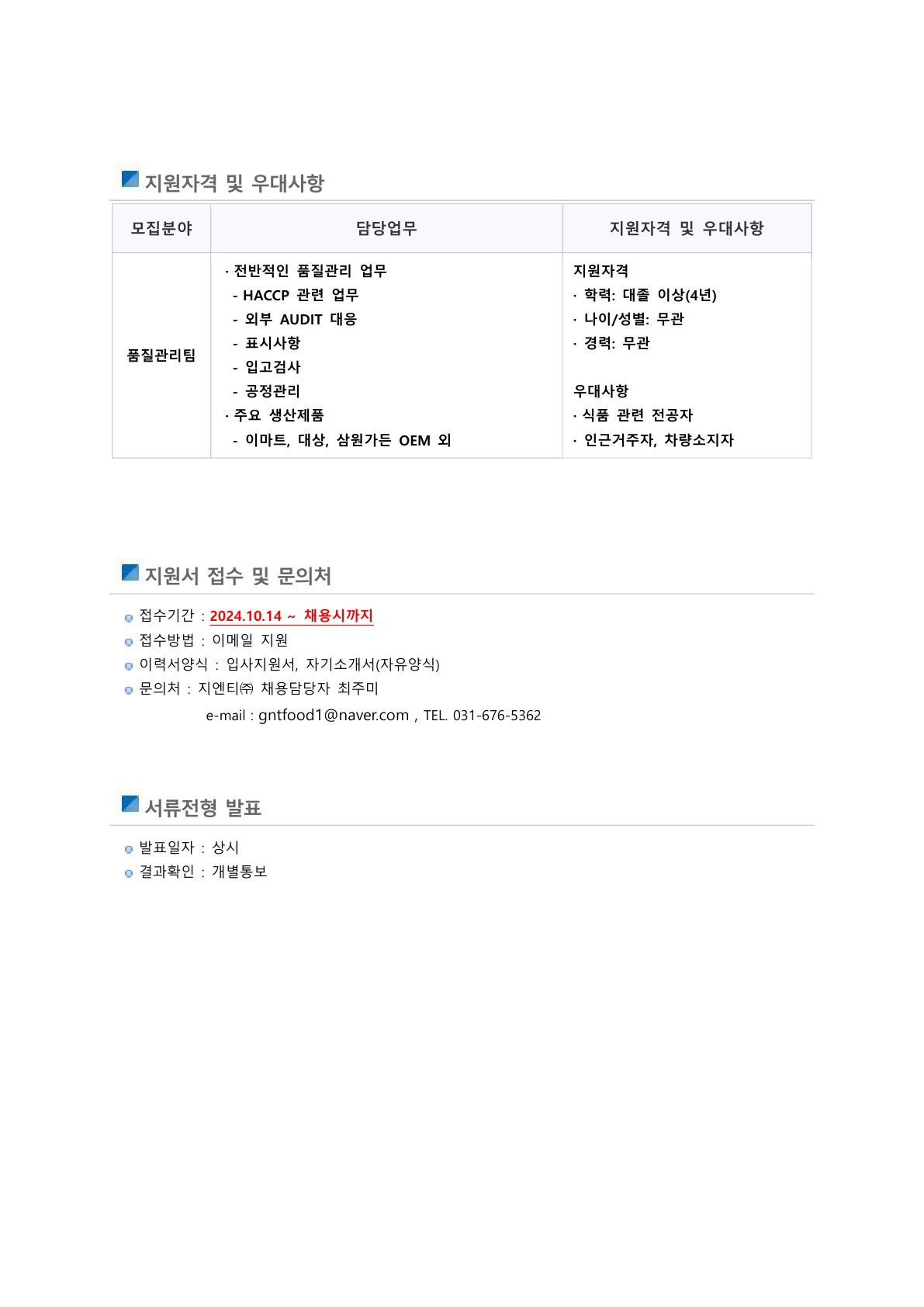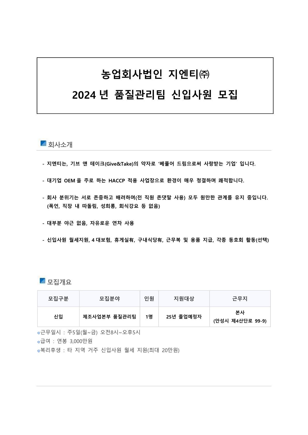 [농업회사법인 지엔티(주)] 2024년 품질관리팀 신입사원 모집