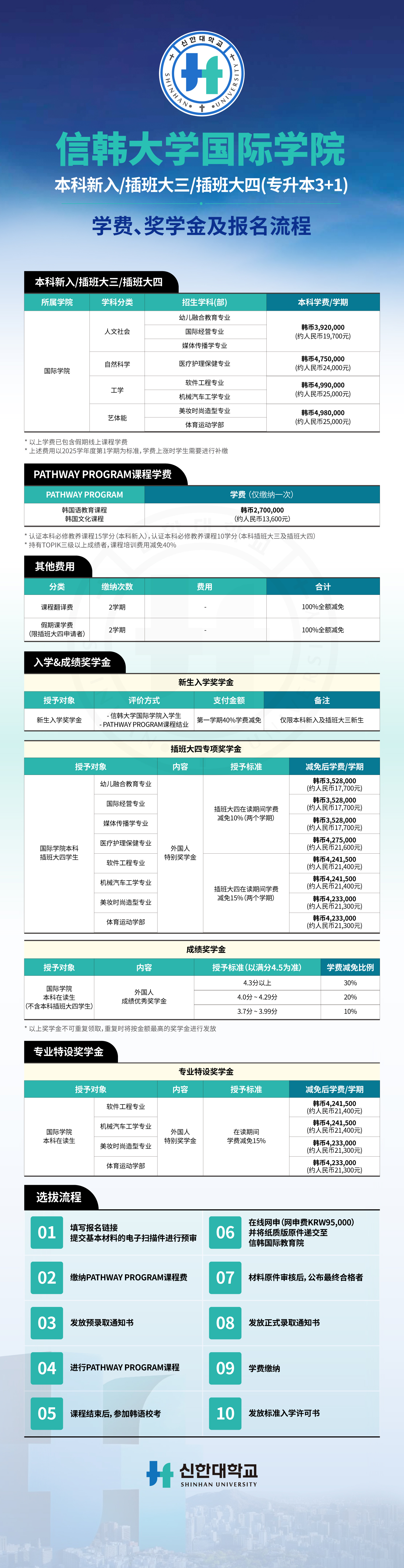 奖学金标准(以成绩为准) 学分标准(满分4.5分) 奖学金金额 4.3分 以上 学费全额的30%奖学金 4.0 ~ 4.29分 学费全额的20%奖学金 3.7 ~ 3.99分 学费全额的10%奖学金 ※ 奖学金仅适用于一年级新生和三年级转学生.