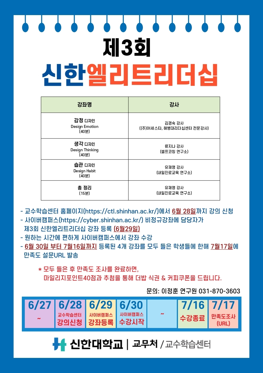 □ 신한대학교(총장 강성종) 교수학습센터에서 6월 30일부터 7월 16일까지 “제 3회 신한엘리트리더십”을 실시한다.